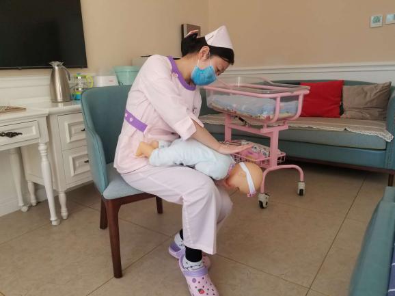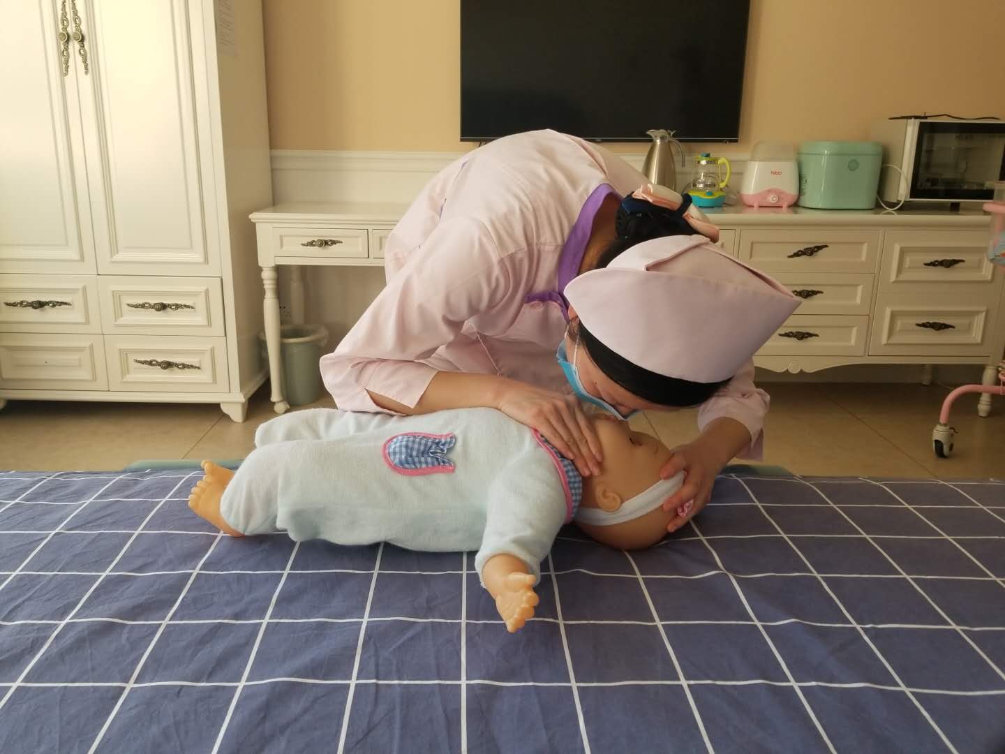 操作方法:立即將患兒取頭低腳高位,俯臥在施救者腿上,讓嬰兒上身前傾45~60度,施救者左手虎口打開、托住嬰兒下頜、打開氣道,用右手掌跟大魚際部位用力扣拍嬰兒背部4—5次,具體位置為背部肩胛骨中間,通過(guò)振動(dòng)使吸入呼吸道的奶汁或痰液排出。